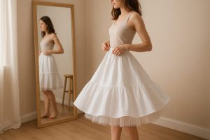 また、ふわっとしたシルエットを演出したいなら、パニエのようなふわふわ素材のアイテムが効果的です。さらに、コーデのアクセントとしてレース付きのインナーを選ぶことで、さりげない可愛らしさもプラスできます。
