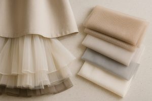 代表的なのは「チュール」や「ハードチュール」と呼ばれる素材。軽さと適度なハリがあり、スカートの下に仕込むことで自然にふんわりと広がる形になります。特にパニエに多く使われる素材で、ドレスのような雰囲気を演出したい場合にぴったりです。